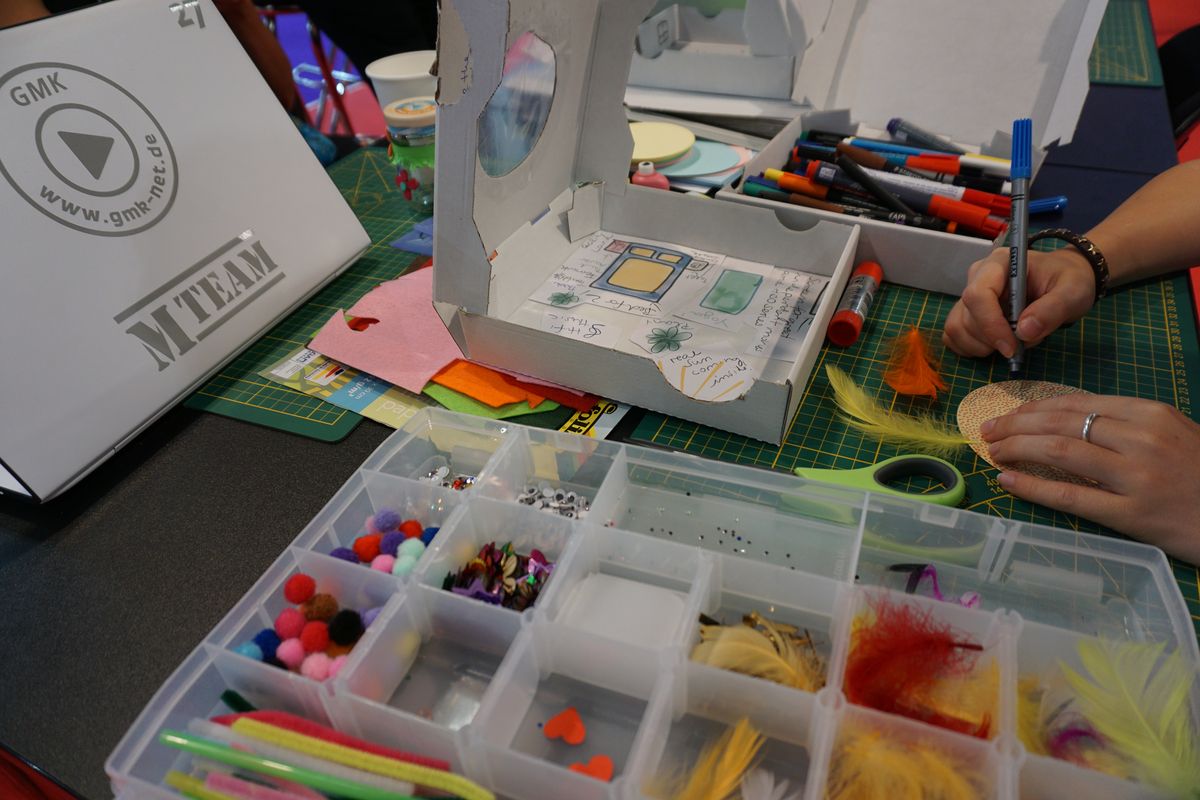Unter dem diesjährigen Motto „Game-Life-Balance“ fanden auf dem Jugendforum NRW wieder vielfältige Aktionen verschiedener medienpädagogischer Einrichtungen statt. Die GMK war diesmal in Kooperation mit der GMK-Fachgruppe Games und dem LVR – Zentrum für Medien und Bildung dabei und ermöglichte den Messebesucher*innen, sich mit dem japanischen Phänomen Hikikomori auseinandersetzte: Vor allem junge Männer ziehen sich für Monate oder Jahre vermehrt aus dem gesellschaftlichen Leben in ihre eigenen vier Wände zurück und bauen sich ein Leben in ihrem Zimmer auf. Die GMK griff dieses Phänomen auf und regte Besucher*innen der gamescom an, sich künstlerisch damit auseinanderzusetzen. Was bewegt jeden einzelnen persönlich, sich von der Gesellschaft zurückzuziehen? Wie müsste der Raum gestaltet sein, um sich vorstellen zu können, darin für mehrere Monate leben zu können? Mit den individuellen und persönlichen Antworten, Meinungen und Gedanken konnten die Besucher*innen ihre eigene Pizzaschachtel gestalten. Bleiben die eigenen Gedanken danach geheim oder sollen sie geteilt werden – das durften alle Teilnehmenden selbst entscheiden. Am Ende ist aus den gesammelten Werken ein Gesamtkunstwerk entstanden.