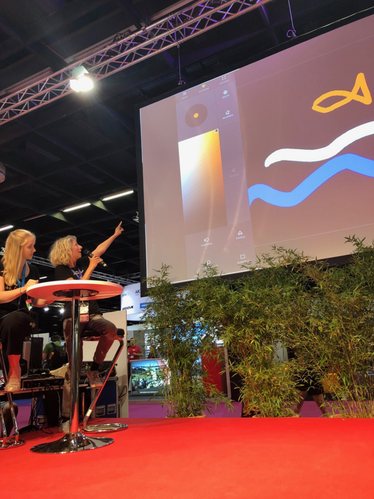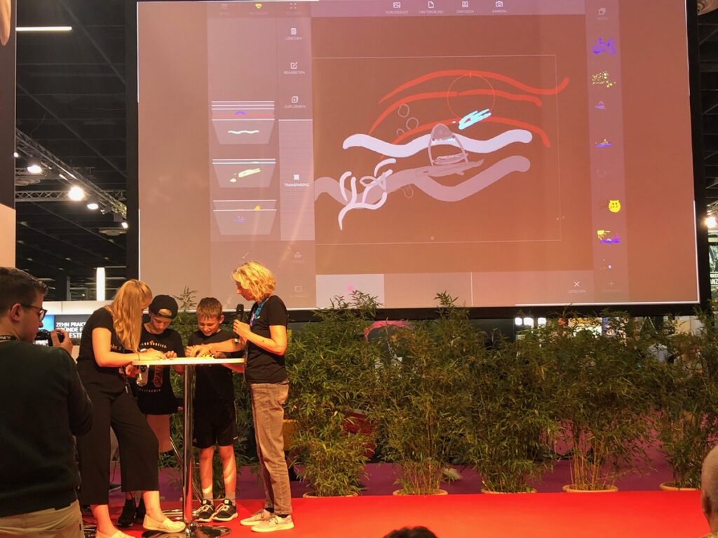 Auch auf der Bühne wurde es kreativ. Am Donnerstag und Freitag wurde eine eigene (Miniatur-)Welt – real und virtuell – erstellt. Gemeinsam mit anderen konnten die Messebesucher*innen aus verschiedenen Bauklötzen und Pappröhren eine einfallsreiche Landschaft gestalten, auf die bunte Fabelwesen, Gruselgeister und dergleichen projiziert wurden. Diese Figuren wurden am Tablet selbst gemalt und konnten zusätzlich animiert und in Bewegung gesetzt werden, um so eine eigene Geschichte zu erzählen.