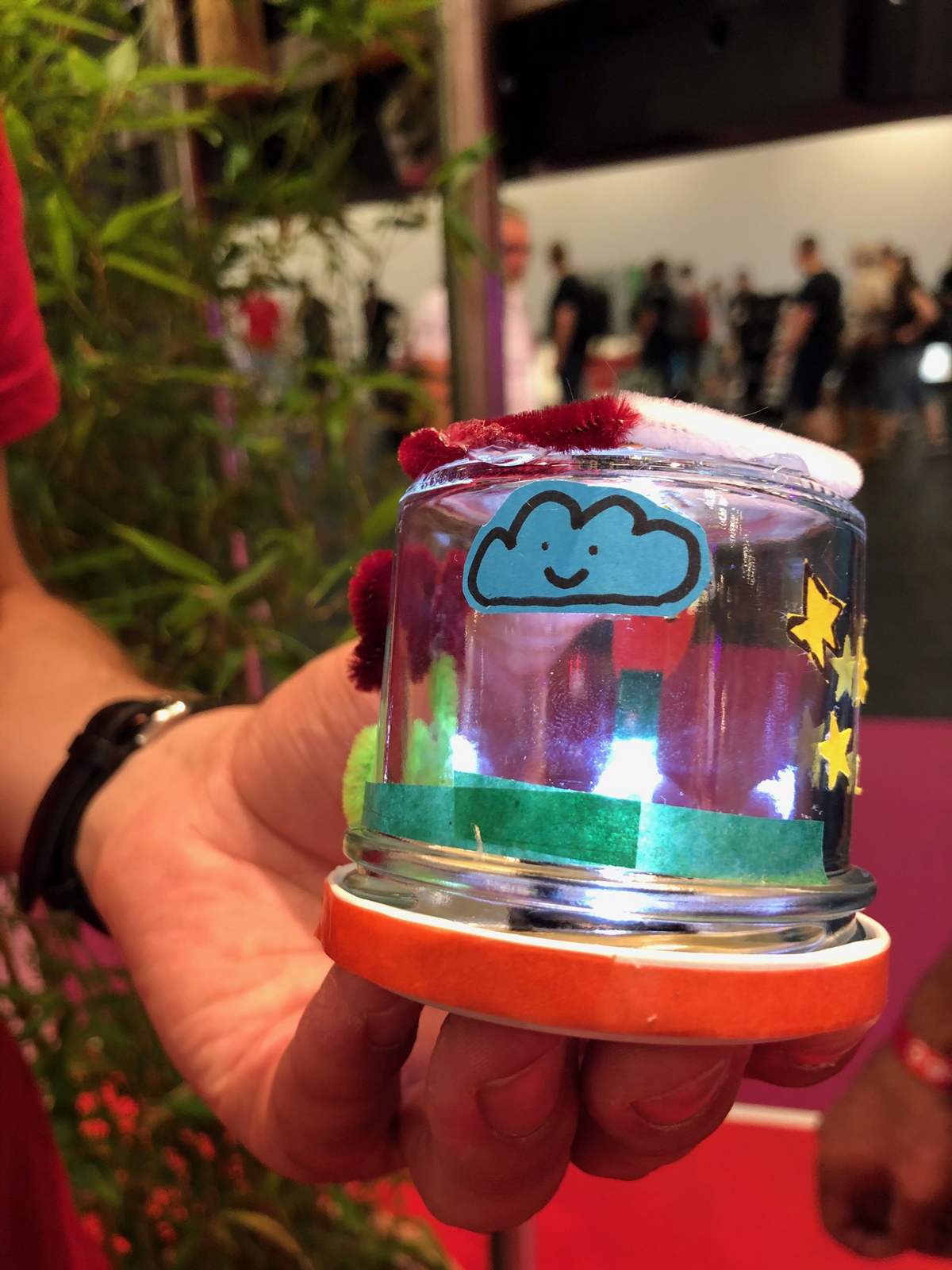 Auf dem Makerspace beim Jugendforum konnten die Teilnehmenden am Donnerstag- und Freitagnachmittag Kipplichter basteln. Dabei wird aus einem leeren Marmeladenglas ein energiesparendes Kipplicht, das man gut als Notbeleuchtung oder als „schnelles“ Licht in einem dunklen Schrank oder auf dem Nachttisch nutzen kann. Das Kipplicht besteht aus nur drei elektronischen Bauteilen, die miteinander verlötet werden. Der „Trick“ ist der Neigungssensor: Wird das Glas gedreht, schließt sich ein Stromkreis und die LED beginnt zu leuchten. Mit Dekomaterialien konnte das Kipplicht kreativ und nach eigenen Vorstellungen verziert werden.